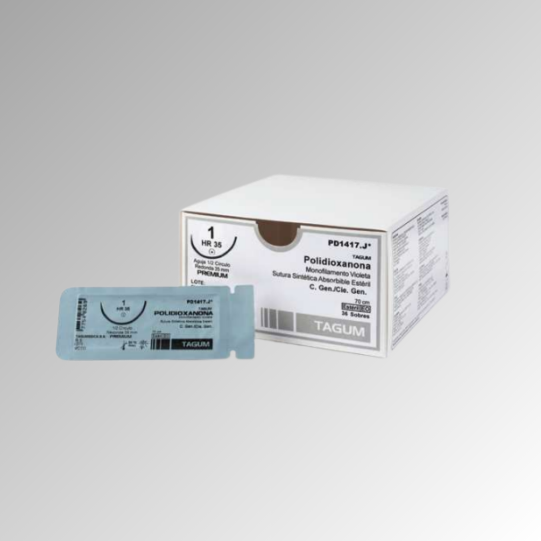 La Polidioxanona es un polímero de poliéster. Es una sutura monofilamento absorbible, la cual puede presentarse incolora o violeta, coloreada con colorantes inocuos. Es apirógena y altamente flexible.