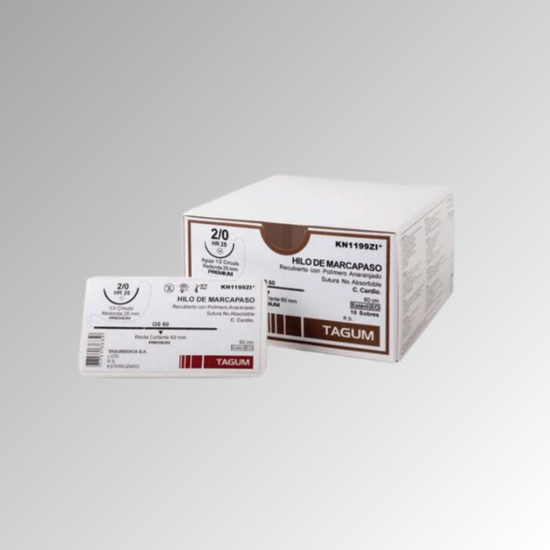 El hilo de marcapaso está compuesto de filamentos de acero quirúrgico recubiertos de polímero de color azul. Esta sutura tiene ensamblada en sus extremidades una aguja curva y una recta: