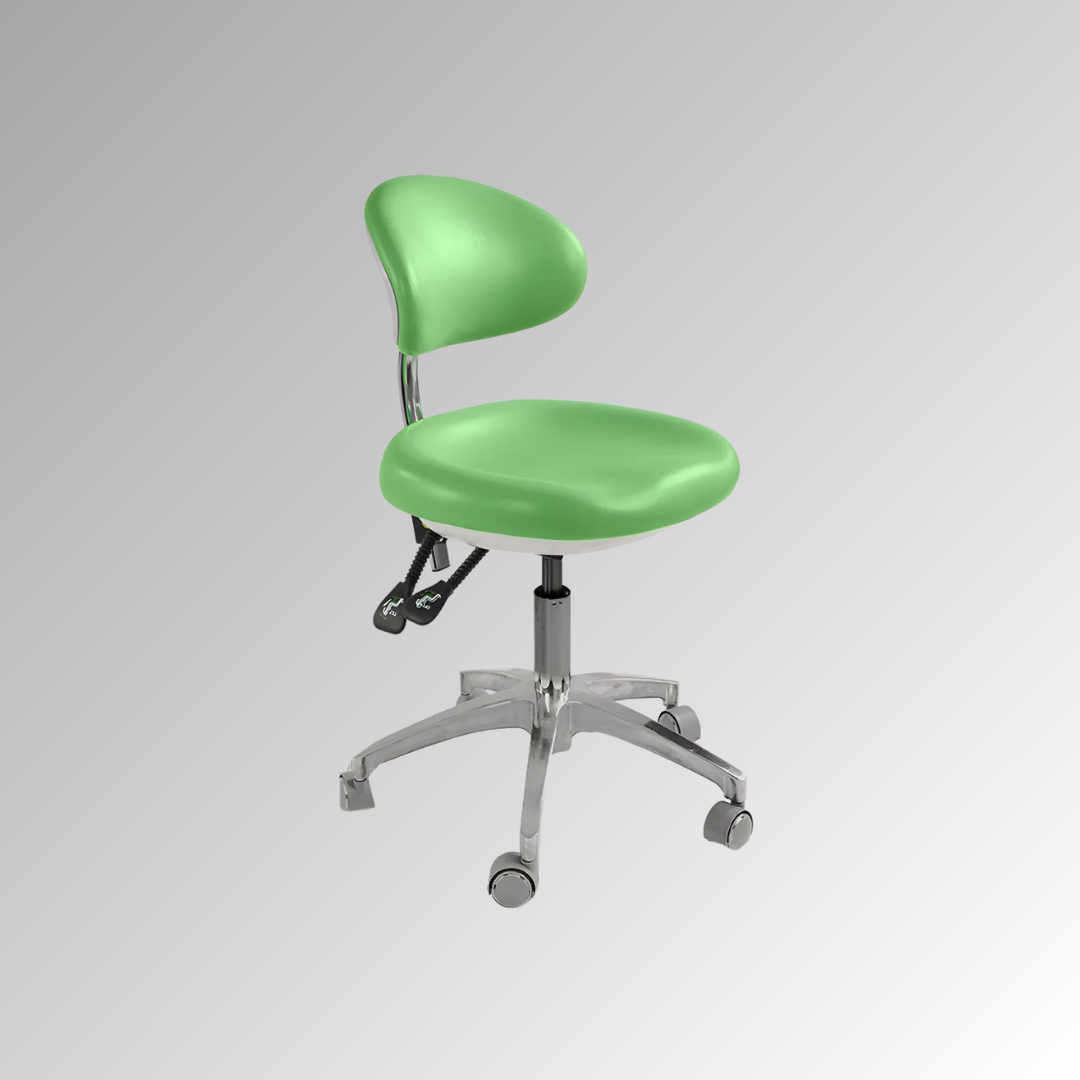 Presentación: unidad x 1 | Uso: asiento para el odontólogo o asistente durante procedimientos dentales | Características: altura regulable, giratoria y acolchada | Material: metal y tapizado sintético.