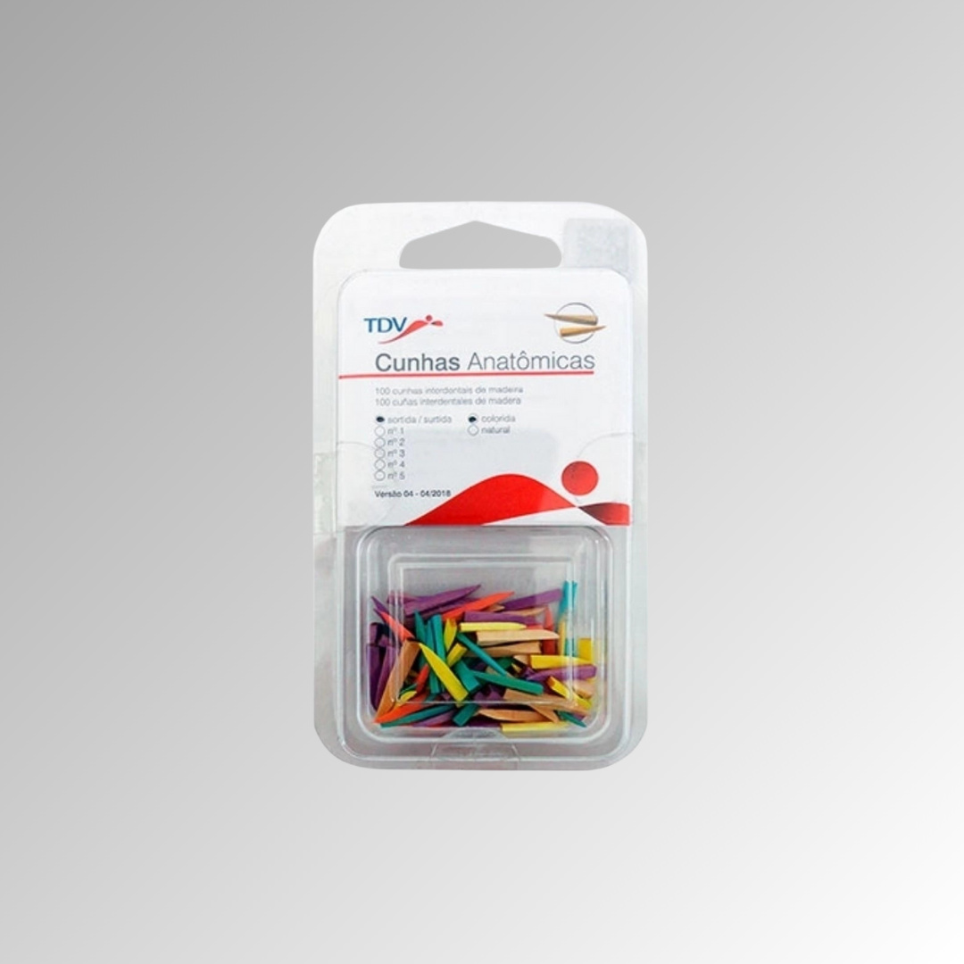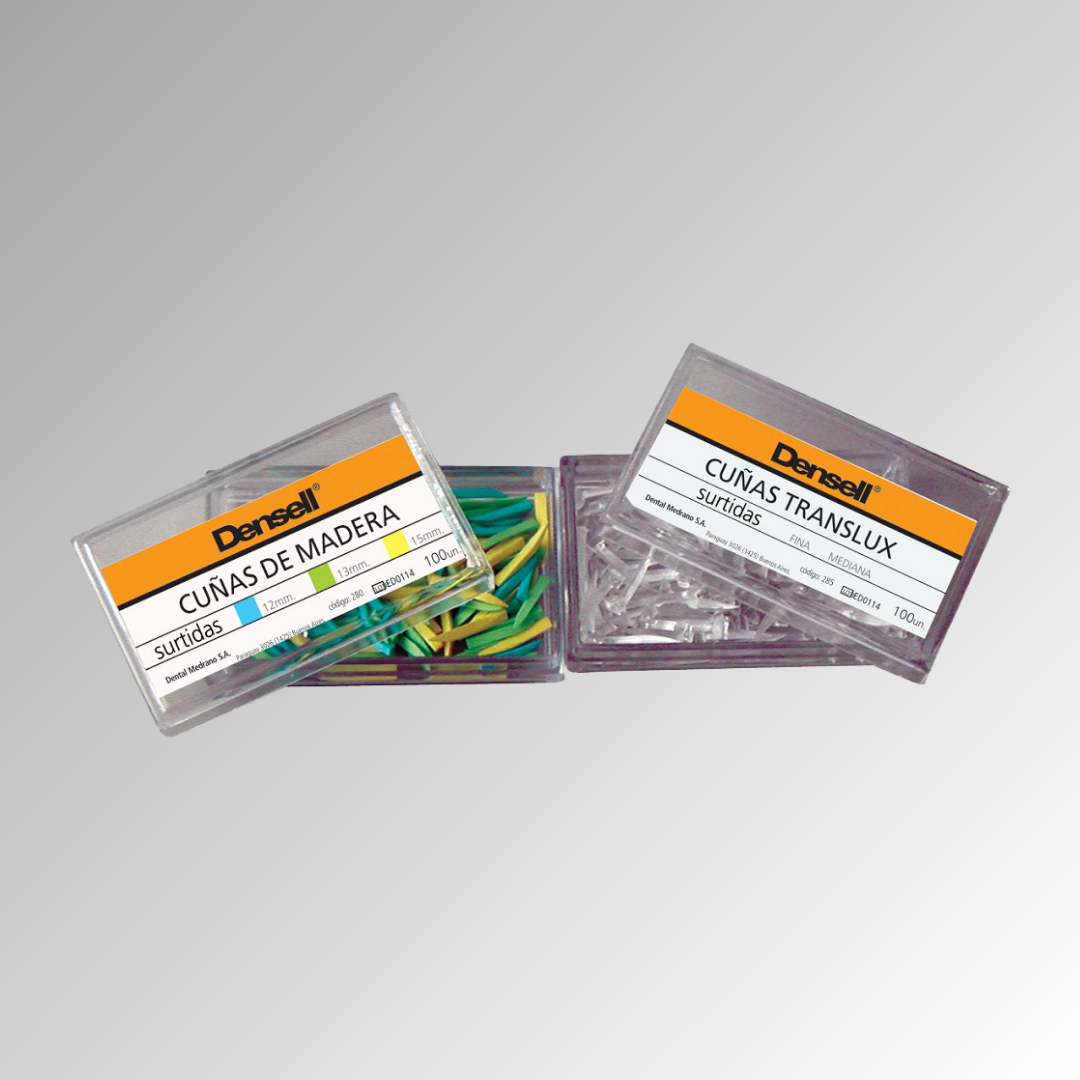 Forma anatómica para la adaptación óptima de la matriz en la zona cervical. Extremo cuadrado para conseguir un agarre seguro y una fácil inserción mediante una perfecta separación del diente. Las cuñas consiguen el espacio necesario para el grosor de la matriz y establecen el punto de contacto perfecto. Protección de obturaciones desbordantes Máxima calidad, confeccionadas en roble Europeo. Presentación: Caja x100 cuñas de madera surtidas Contiene 1/3 aprox. de cada tamaño (chico-mediano-grande)