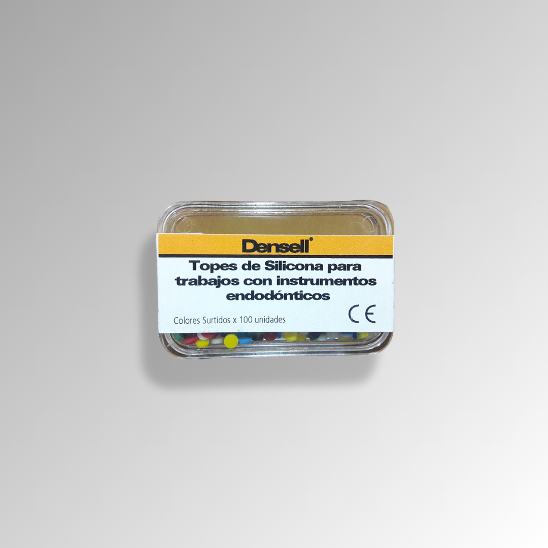 Topes para insertar en el instrumento de endodoncia, que al fijar se regulan hasta que punto el instrumento penetra en el canal, de manera de no pasar el ápice, pues en este caso dejaría el canal y entraría en el hueso. Presentación: 1 cajita x100 Topes de silicona - colores surtidos Marca: DENSELL.